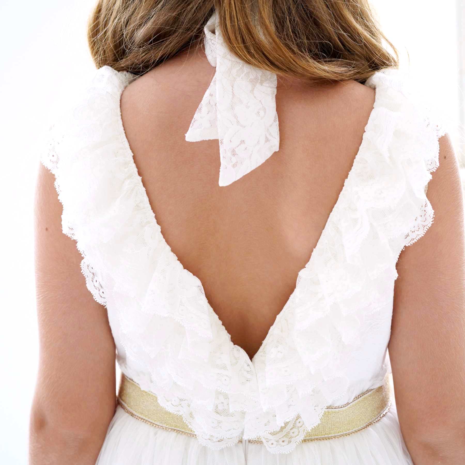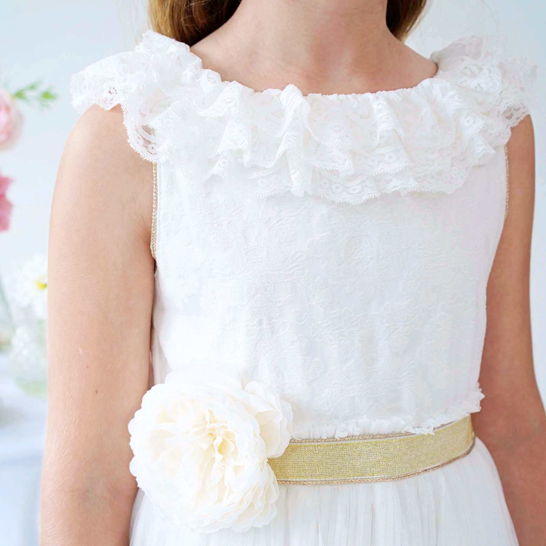 Robe cérémonie fille longue blanc cassé, en coton et dentelle avec jupe en voile et détails dorés à la ceinture et emmanchures. Coupe ample et fluide.