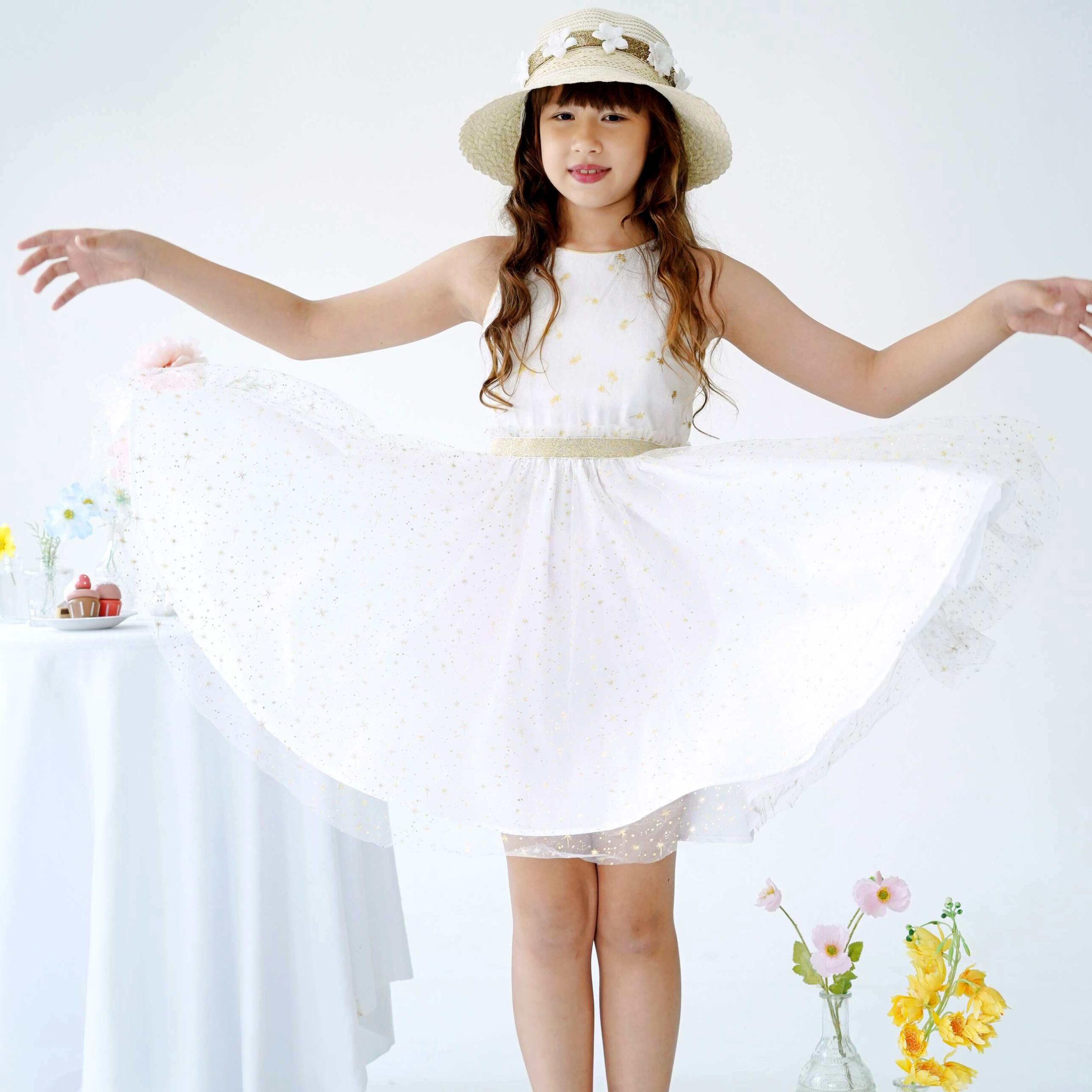 Robe demoiselle d’honneur blanche fille en tulle blanc à paillettes dorées, doublée de coton. Robe de cérémonie enfant qui tourne à l’horizontale, idéale pour mariage, fêtes d’été et Nouvel An. Coupe patineuse élégante. Modèle disponible tailles 2 à 16 ans.