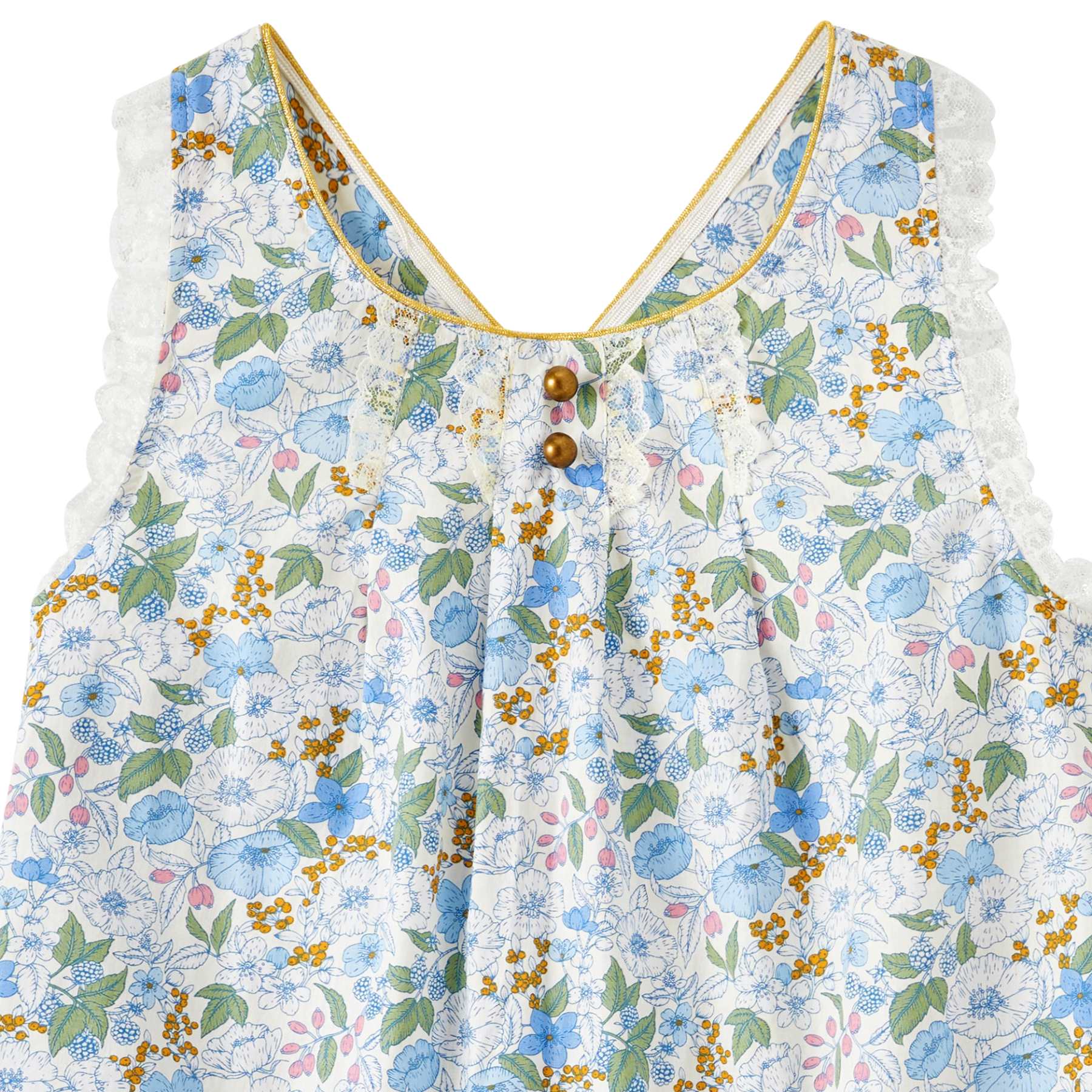 Robe de cérémonie fille en coton liberty bleu clair, fleurs rose et bleu pastel. Avec ces bretelles croisées bordées de fine dentelle beige mordorée, la robe Anaïs est idéale pour un mariage bohème chic ou un cortège aux teintes douces et romantiques. Du 2 au 16 ans