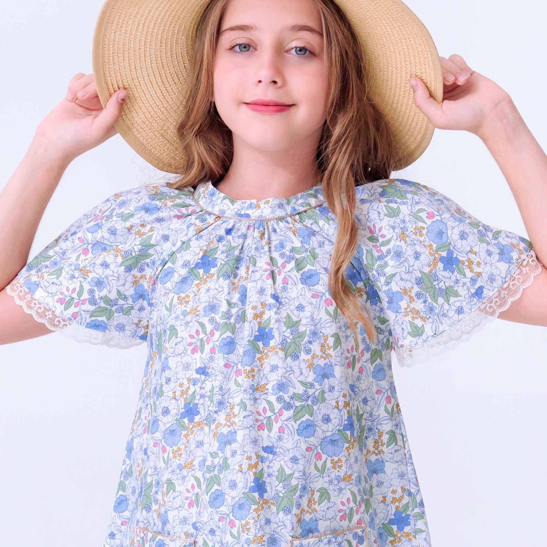 Délicate et lumineuse, la robe Butterfly se décline ici dans un coton liberty bleu clair, à l’imprimé fleuri délicat mêlant nuances de bleu ciel, vert tendre, rose poudré et fines touches dorées. Une palette lumineuse et douce, pensée pour les robes de cérémonie fille portées durant la belle saison.