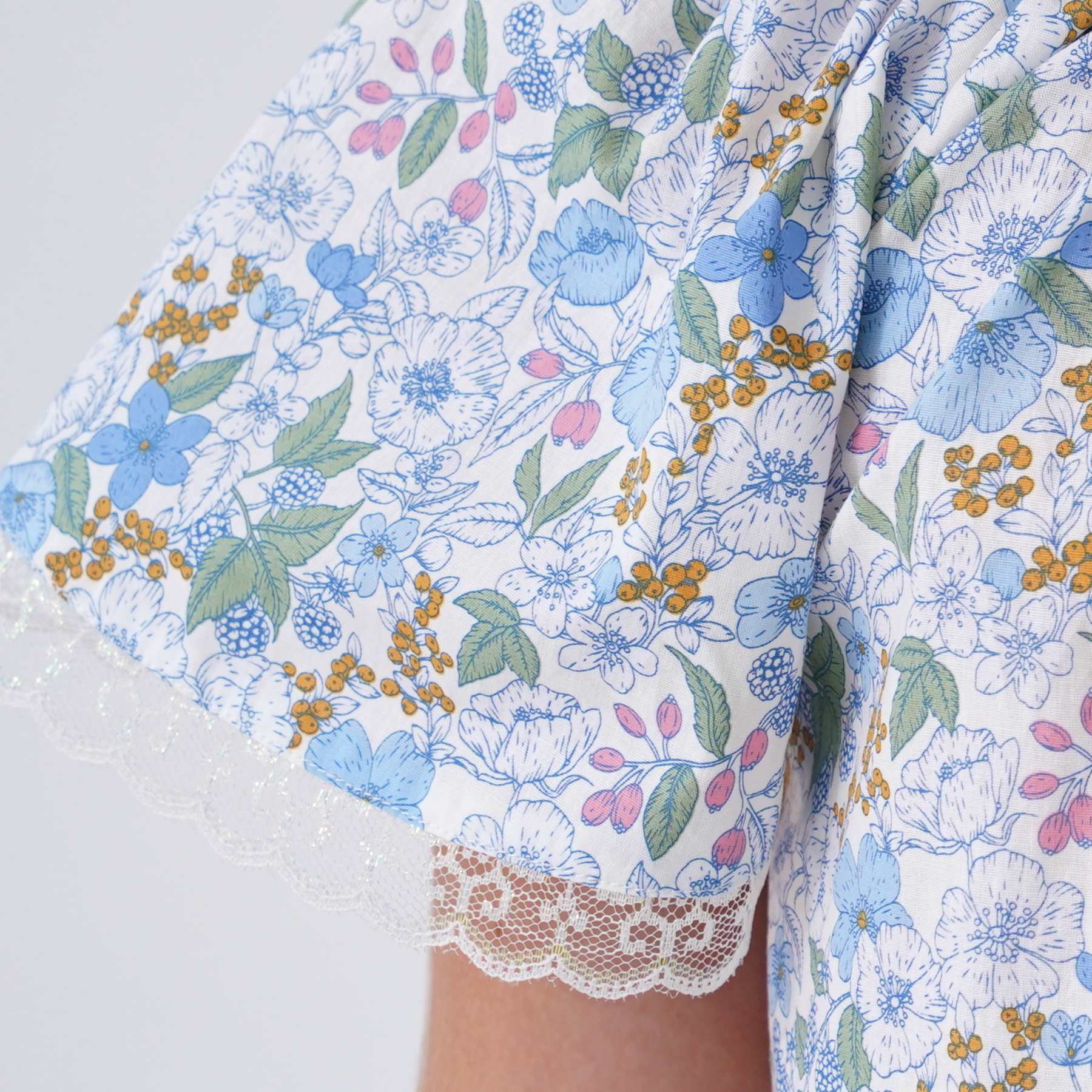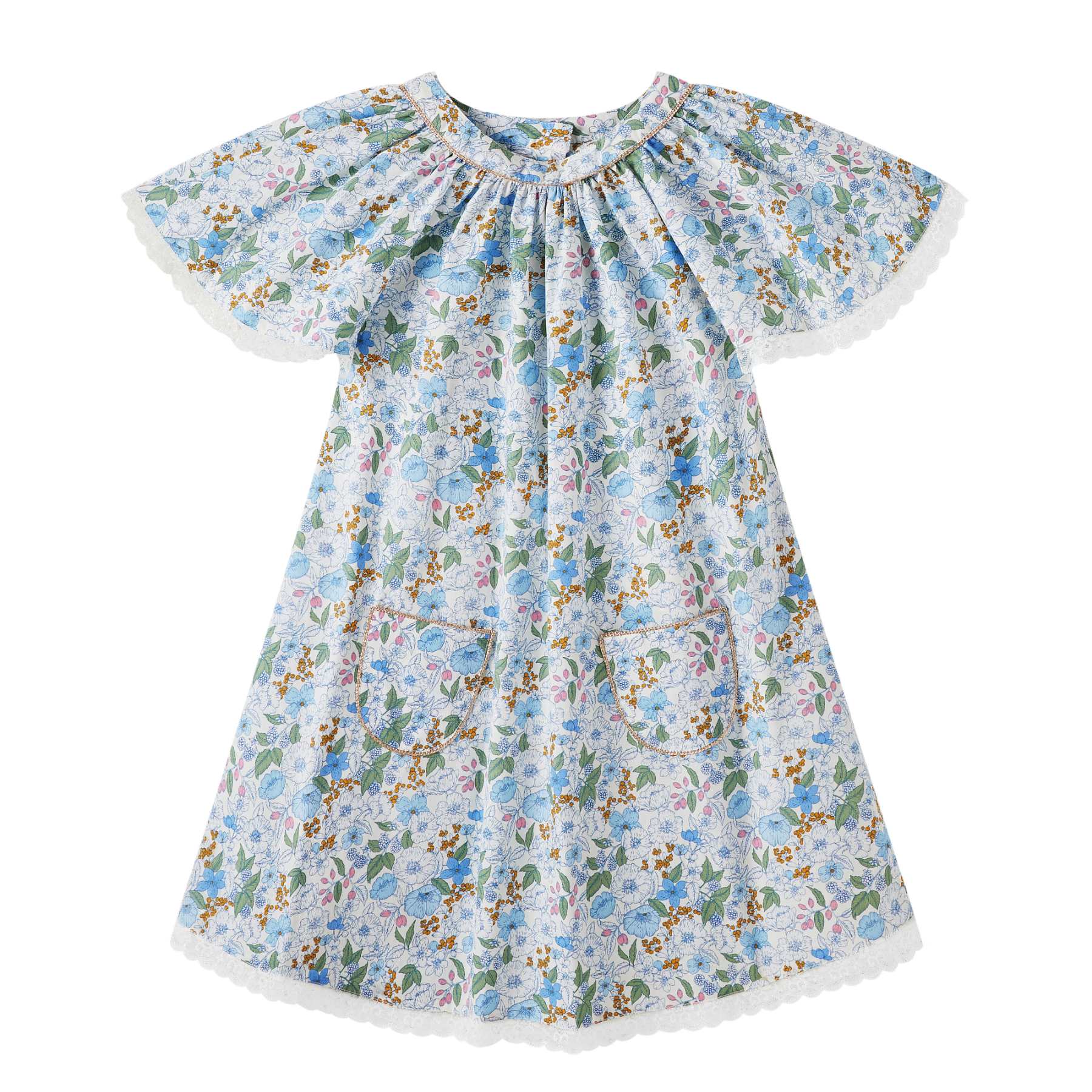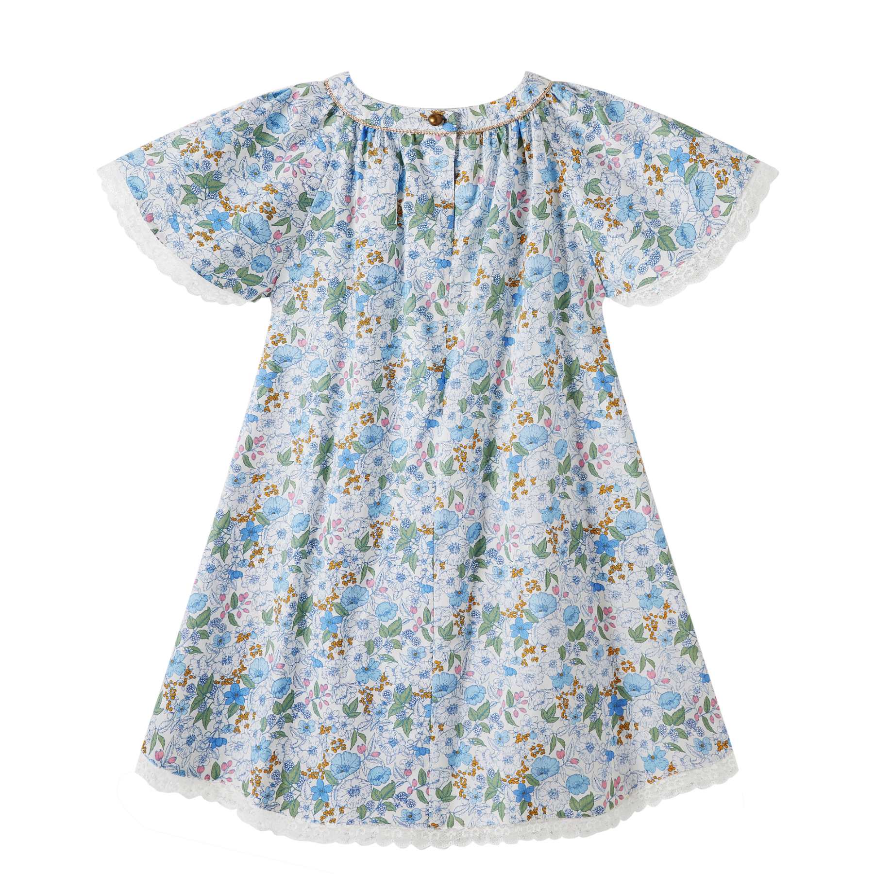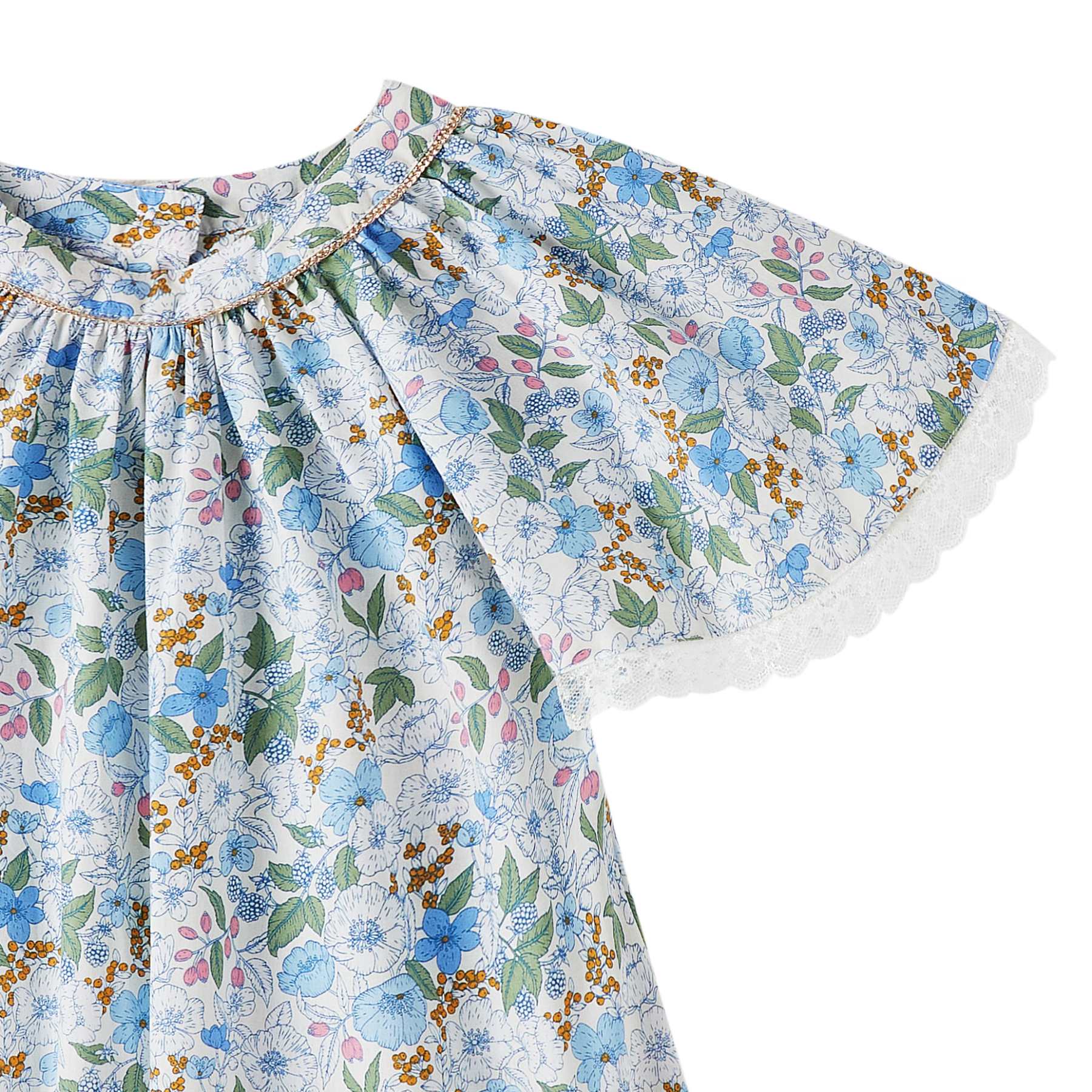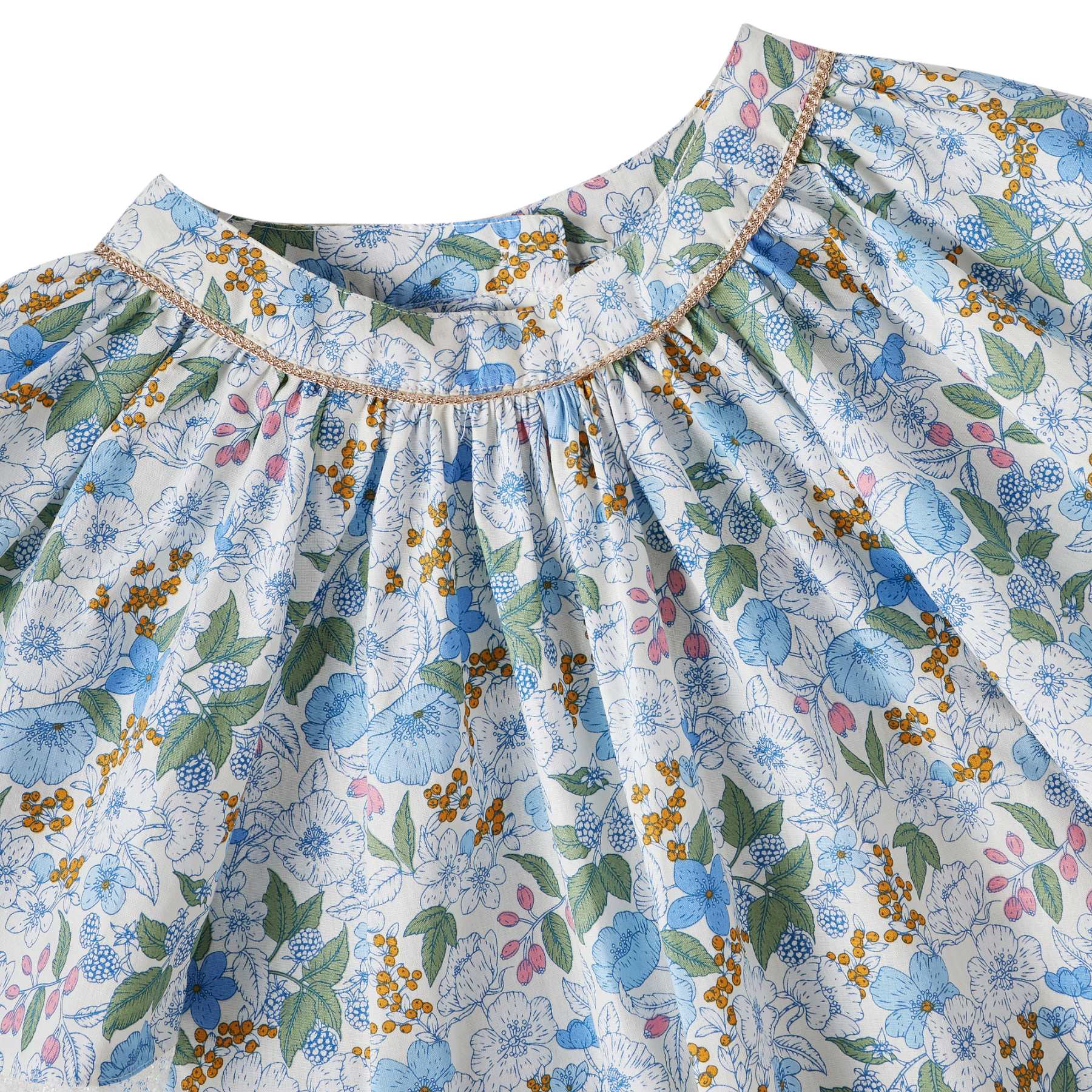 Le coton fleuri liberty, dans des tonalités de bleu foncé, jaune et doré, apporte du caractère à la robe tout en conservant une allure raffinée. Le col arrondi, souligné par un biais doré aux accents cuivrés, structure délicatement l’encolure. Une fine dentelle beige mordorée, présente au col et au bas de la robe, vient parfaire l’ensemble avec discrétion.