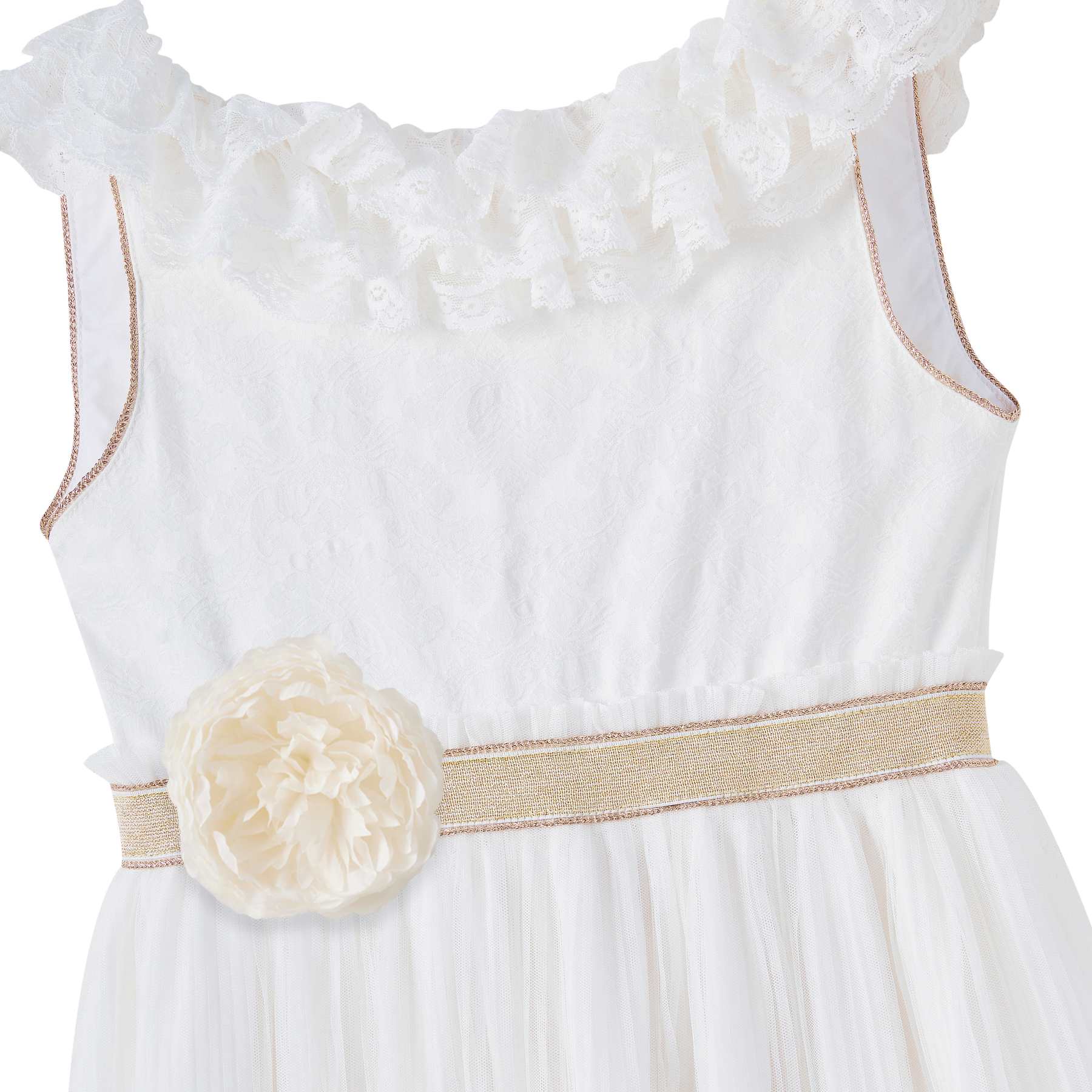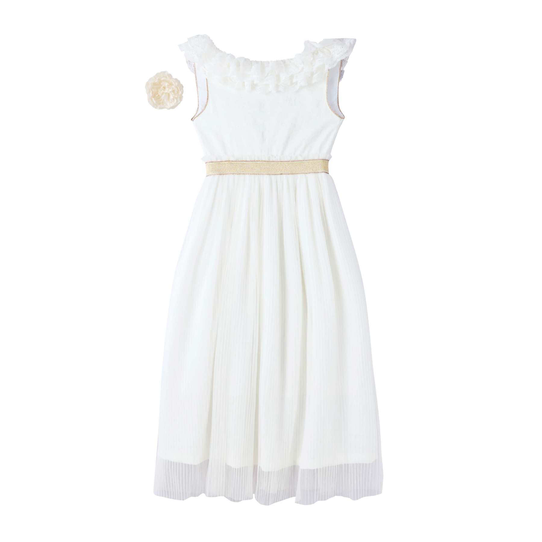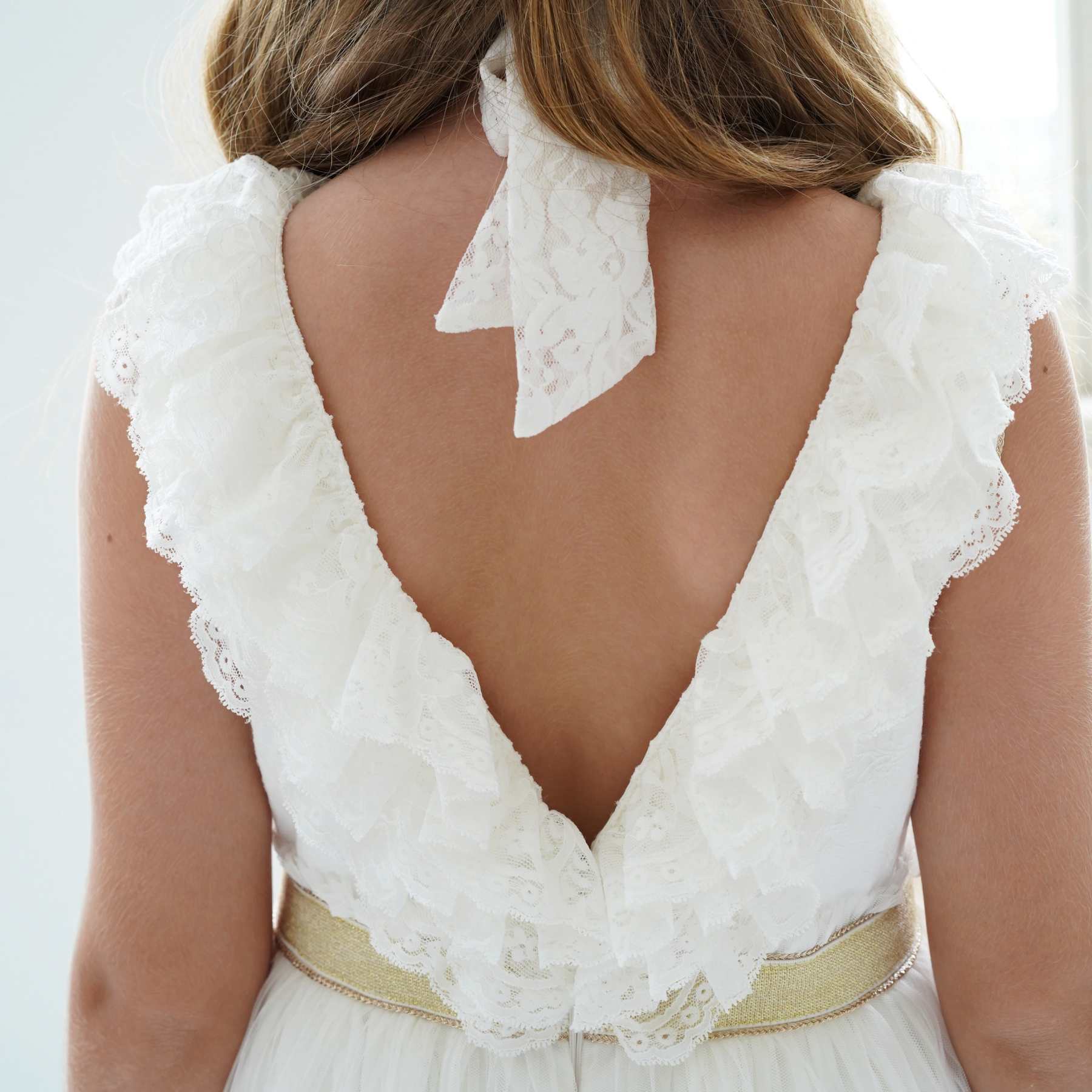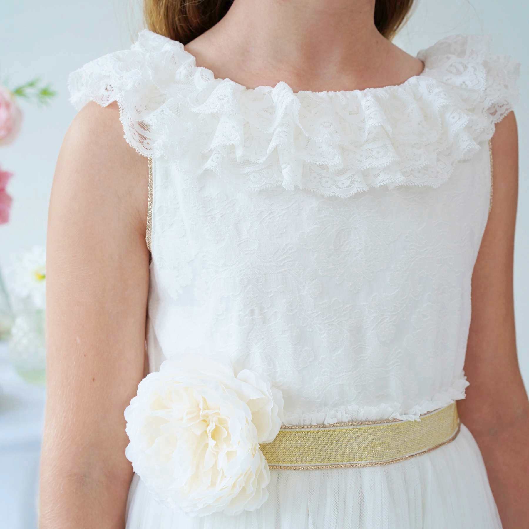 Buste blanc avec volants en fine dentelle, dos en V orné de froufrous, ceinture dorée avec fleur blanche amovible, emmanchures finies d’un biais doré. Jupe longue en tulle blanc plissé, fluide et élégante. Modèle chic et bohème pour filles et adolescentes de 2 à 16 ans.