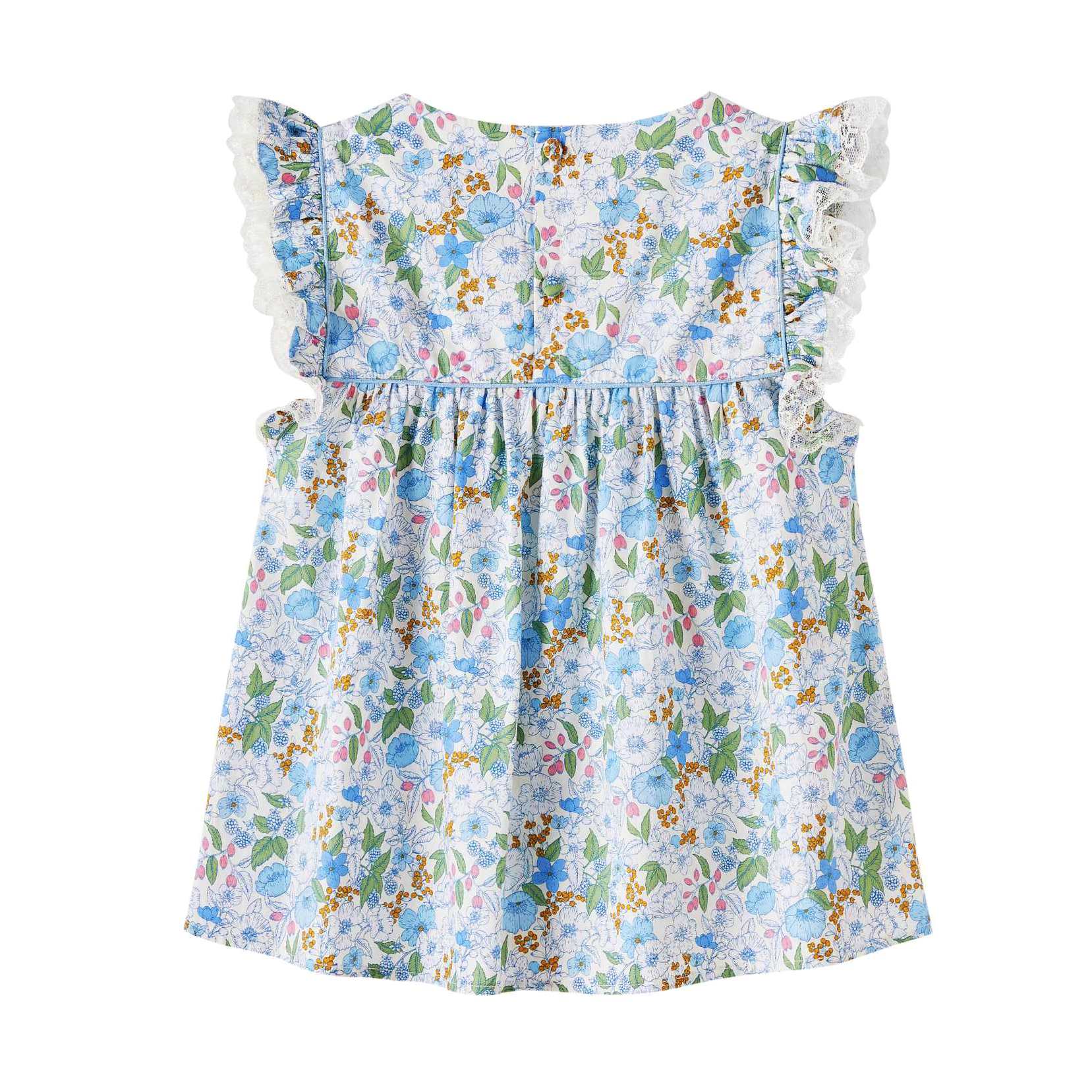 Blouse liberty fille bleu ciel à volants et dentelle, légère et confortable. Style bohème chic, idéale pour l’été, l’école et les cérémonies. Tailles 2-16 ans.