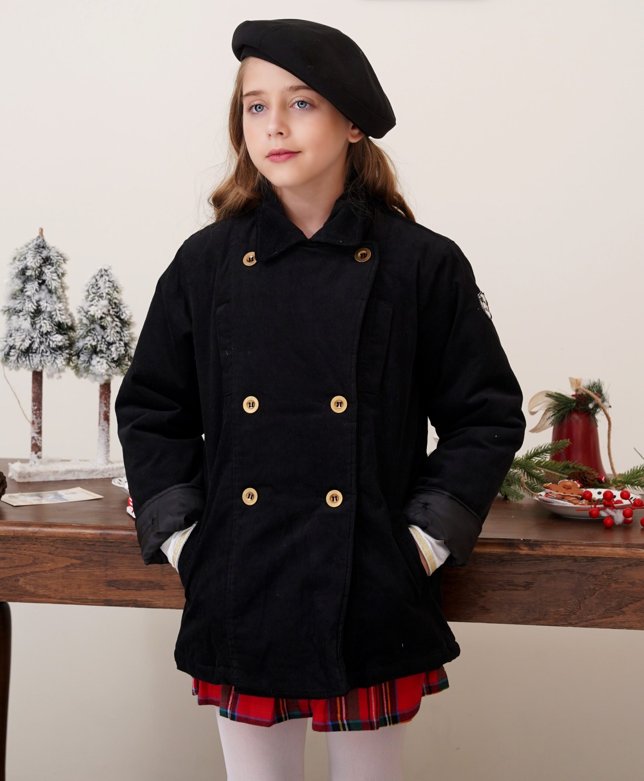 Classique, chic et très tendance, offrez du style avec cette belle veste caban en velours côtelé noir pour enfant (fille et garçon) de 2 à 16 ans.